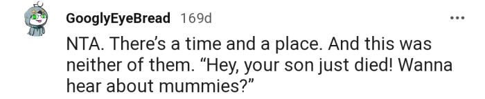 She spent what felt like a lifetime talking about South American indigenous mummies and an ancient native boy buried with a "killed instrument." While the topic might have been exciting in a college class, OP found it inappropriate and disrespectful given the occasion.