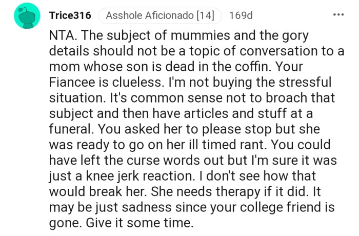 The Reddit community is torn in its verdict. While a majority believe OP's statement was harsh, the commenters agree that his fiancée shouldn't have brought up such a topic during a time of grief.
