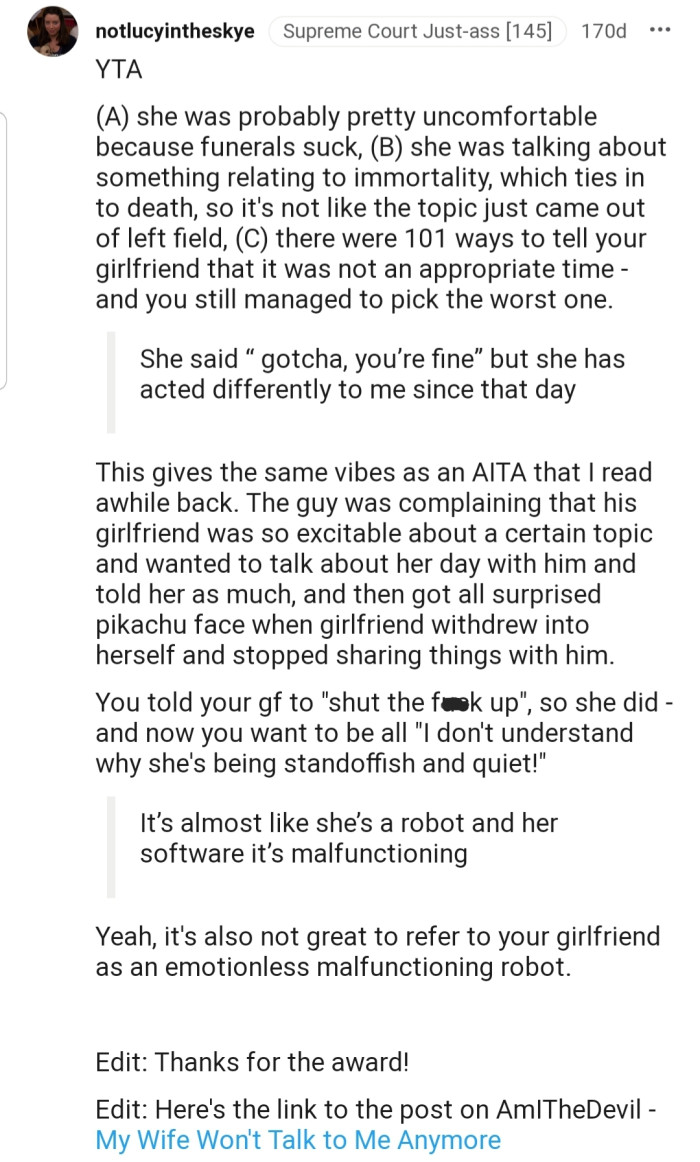 Reddit.comOP and his fiancée attended a mutual friend's burial to grieve. But his fiancée spent the day talking about archaeology