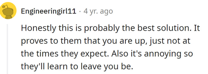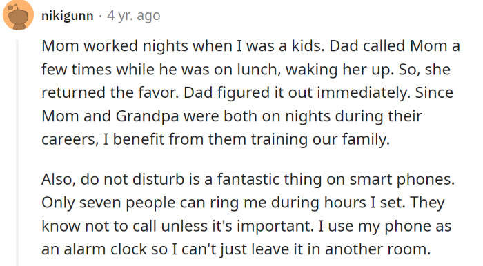 However, there was a third solution among the comments that suggested she call him in the middle of his night sleep.