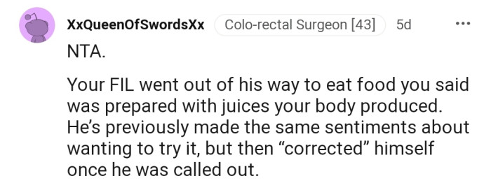 "NTA. Your FIL went out of his way to eat food you said was prepared with juices your body produced."