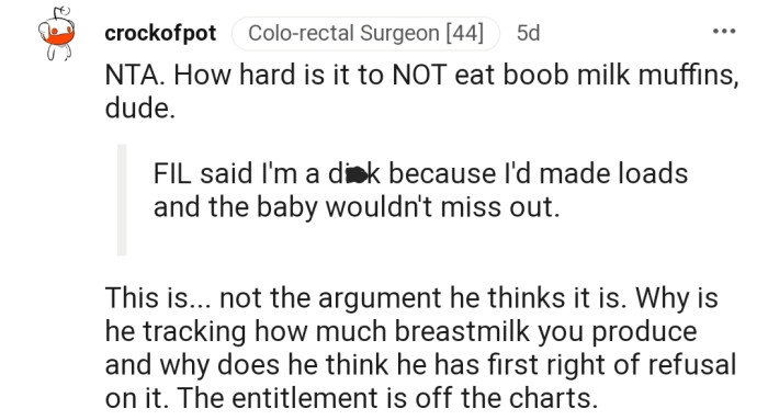 Reddit.comRecently, OP's FIL came over to the house and was fixated on eating the muffins OP made for her baby using her breast milk. Consequently, OP kicked him out after accusing him of being creepy and a pervert.