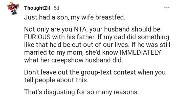 Outraged, OP confronted her husband's father, only to be met with an absurd defense. Her FIL's behavior confirmed his creepy obsession with breast milk, which surprised even her husband.