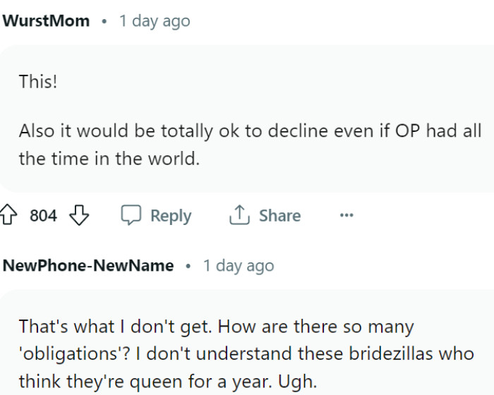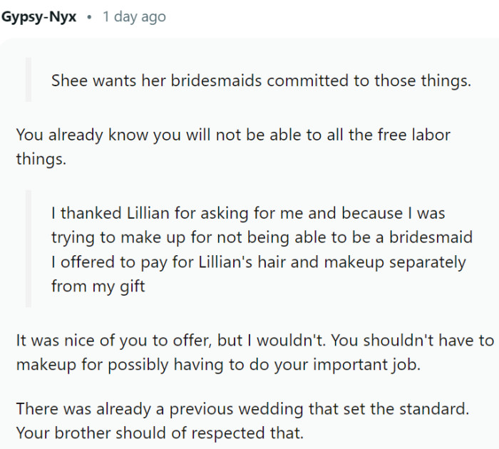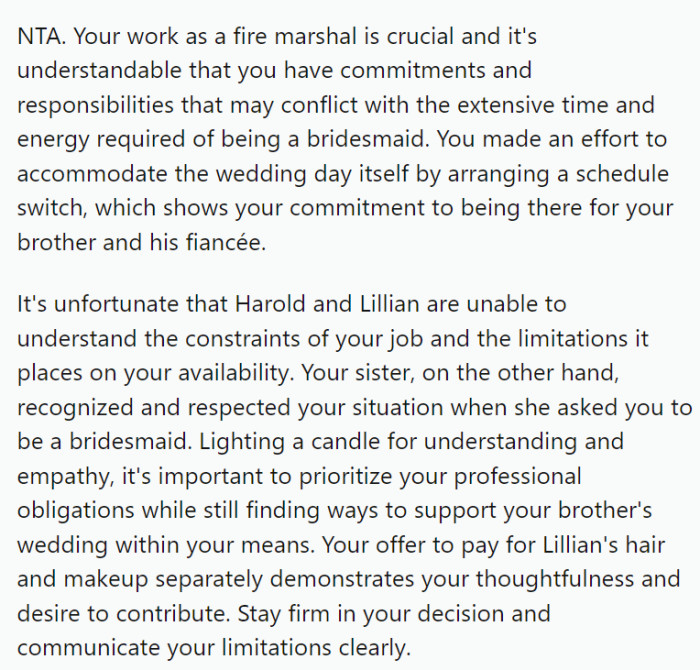 All these tasks require a significant amount of time and effort. OP, a fire marshal with a demanding and unpredictable work schedule, was asked by her brother Harold's fiancée, Lillian, to be a bridesmaid.
