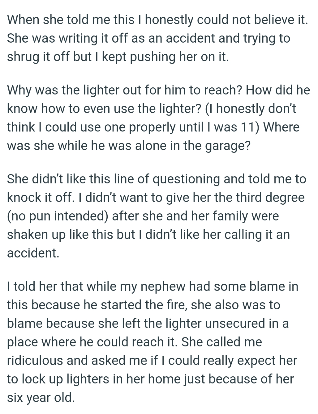 I might be TA because I was asking my sister questions about how the fire started, then shifted blame onto her for the incident.The Reddit post got hundreds of comments and here are a few of them