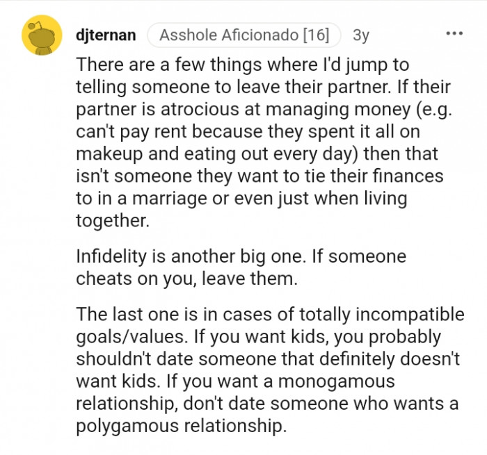Just like the Reddit user who brought this issue to the AITA subreddit page, you might have also noticed this trend. There's hardly a story of couple's conflict where you won't see comments urging one person to leave the other.