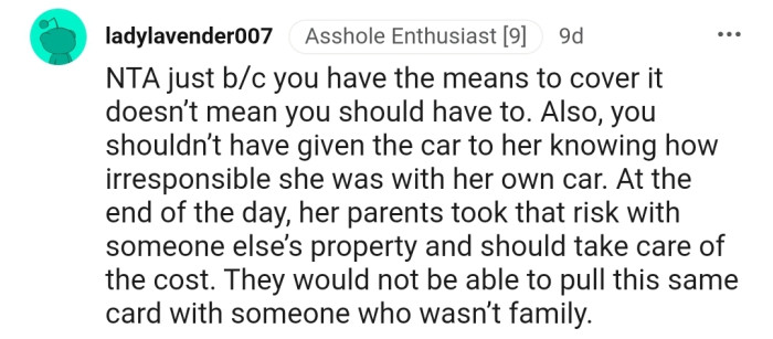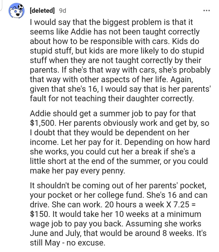 "She’s already proven to be an awful driver, and it’s not on you to take a financial hit for their poor parenting."