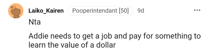 "Addie needs to get a job and pay for something to learn the value of a dollar."