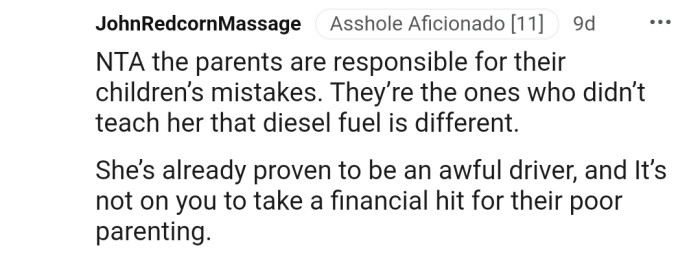 "NTA—how do you even accidentally use diesel? She probably should not be driving a car unaccompanied."