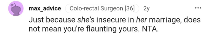 "Just because she's insecure in her marriage does not mean you're flaunting yours."