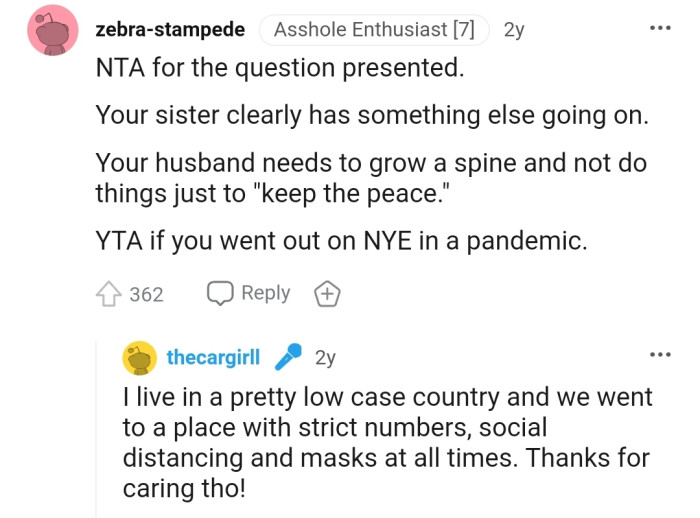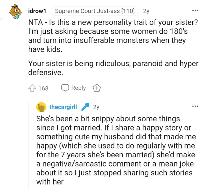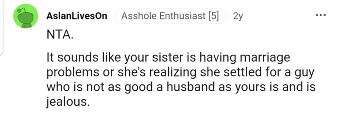 "Sis sounds a little insecure, or maybe her husband is kind of a judgy jerk to her."