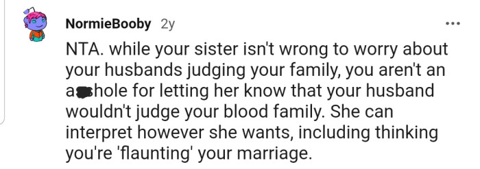 Reddit.comOP assured their sister that their husband isn't a judgmental person, but it seems their sister has interpreted the statement the wrong way.