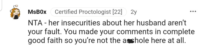 "You made your comments in complete good faith, so you’re not the asshole here at all."