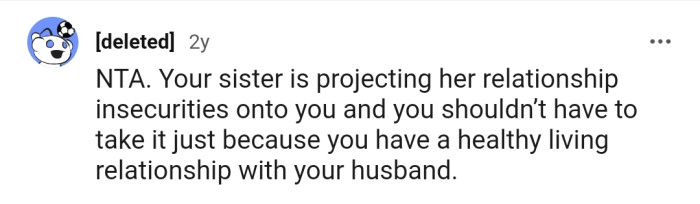 "Your sister is projecting her relationship insecurities onto you, and you shouldn’t have to take it."