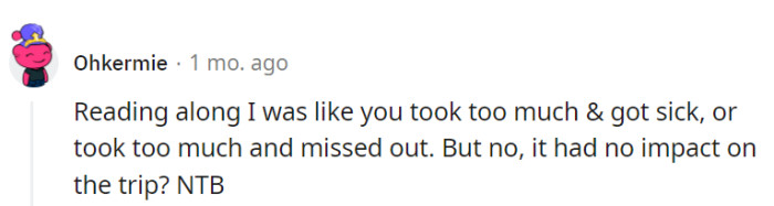 During the vacation, an unexpected twist occurred when OP, not realizing that marijuana was legal in the state they were visiting, decided to indulge in edibles. She bought a bag of chocolates and consumed them discreetly at the end of the day, ensuring it didn't interfere with the planned activities or disrupt the group.