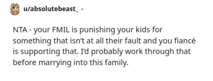 The OP stood up for her kids, but her fiancé wasn't cooperating. Eventually, the kids will notice this kind of disrespect, causing emotional pain.