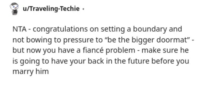 She let her fiancé and his mom have an earful and decided to bail on the trip, canceling her ticket. The man is blaming her for stirring up family drama.