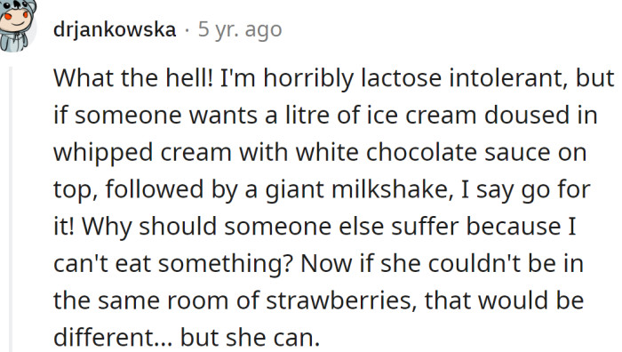 However, her MIL complained, stating it was unfair since she couldn't eat strawberries. The OP told her that she had no plans to share and mentioned that she frequently eats foods that the OP can't but still receives no complaints from the OP.
