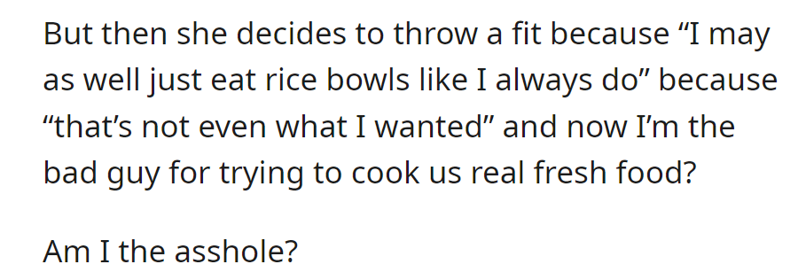 "Now I'm the bad guy for trying to cook us real fresh food?"