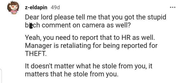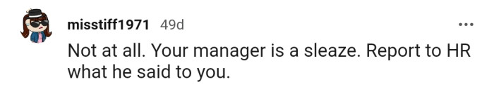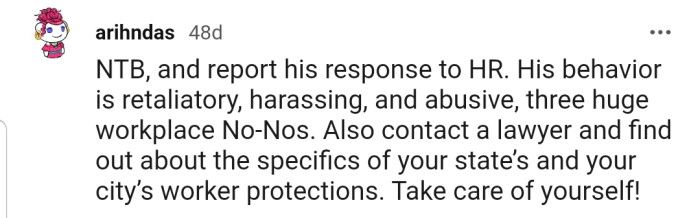 "NTB and I’d call HR again over the comment. He is creating a hostile work environment."