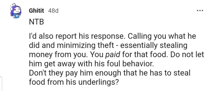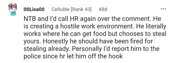 One practical solution for mitigating issues like food theft is to implement a shared food policy that encourages employees to label their items and communicate openly about shared resources. This approach not only fosters accountability but also promotes a culture of respect for personal belongings.