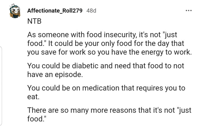"As someone with food insecurity, it's not 'just food.' It could be your only food for the day that you save for work so you have the energy to work."