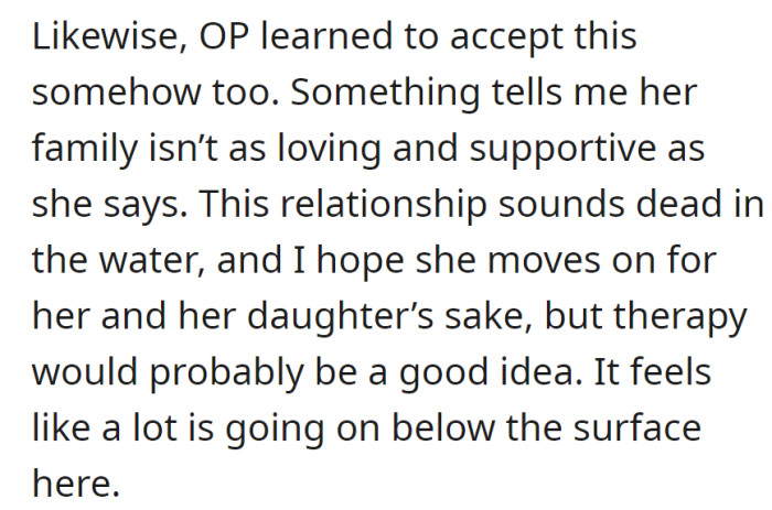 After hearing the OP's story, Redditors advised her to take a trip to visit her own family and think about her relationship. They told her they believed her partner had no respect for her and that she should do better for herself and her daughter.