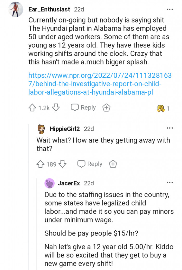 "The Hyundai plant in Alabama has employed 50 underaged workers. Some of them are as young as 12 years old."