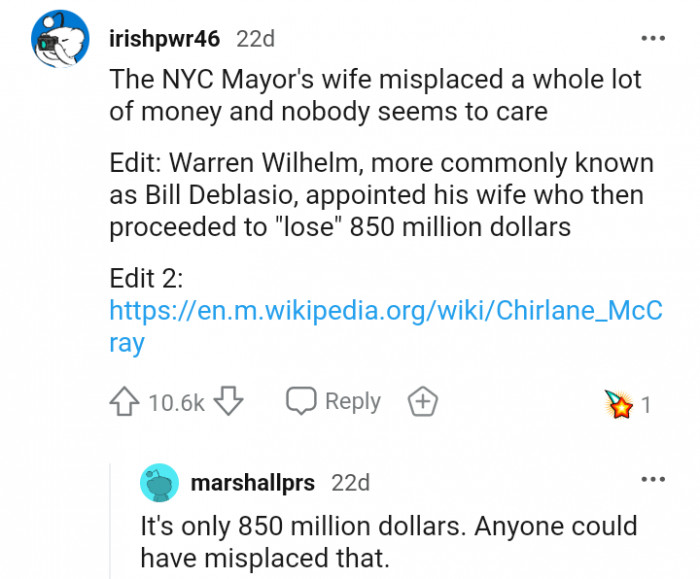 Late_Cicada6740 / reddit.com"The NYC Mayor's wife misplaced a whole lot of money, and nobody seems to care"