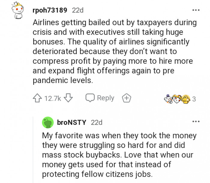 "Airlines getting bailed out by taxpayers during a crisis while executives still take huge bonuses."