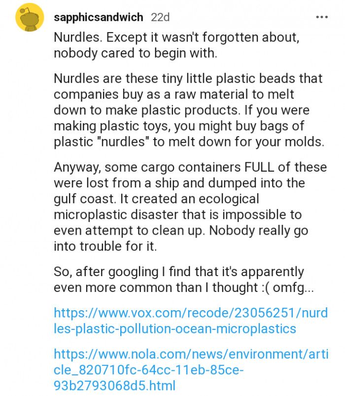 "Nurdles. Except it wasn't forgotten about; nobody cared to begin with."