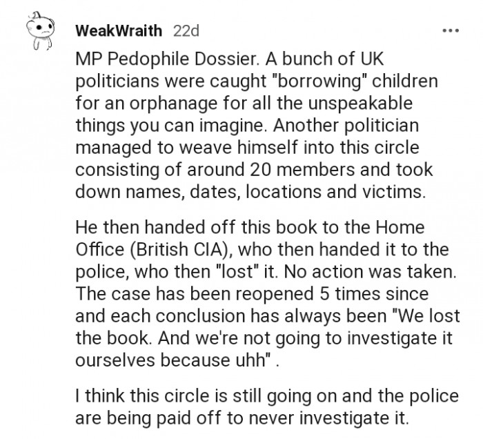 "MP Pedophile Dossier. A bunch of UK politicians were caught 'borrowing' children for an orphanage for all the unspeakable things you can imagine."