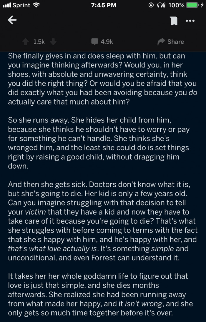 The age-old tale of the one who truly cares about her gets left behind as she chases anyone or anything that is harmful to her. Forrest never gives up; he really doesn't know any better than to keep following her. But the pain for Jenny is too much for her to bear.