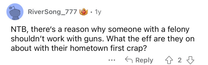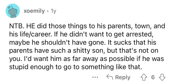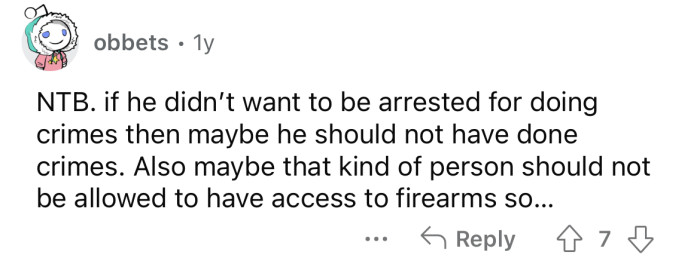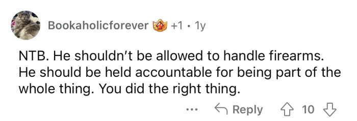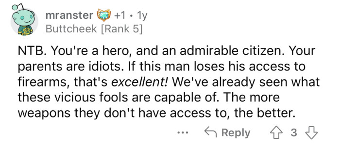 Despite not supporting the man's actions, OP's parents felt that ratting him out wasn't the right thing to do. They said the OP had victimized the man's parents and potentially ruined his life and career since he worked at a gun store and would be banned from handling firearms for life.