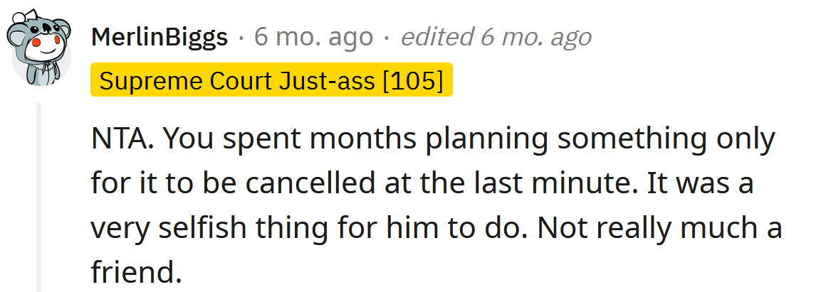 What are your thoughts on this situation? Do you think the OP is being too harsh on his friend here, or is his friend the one who should be apologizing for flaking on their trip?