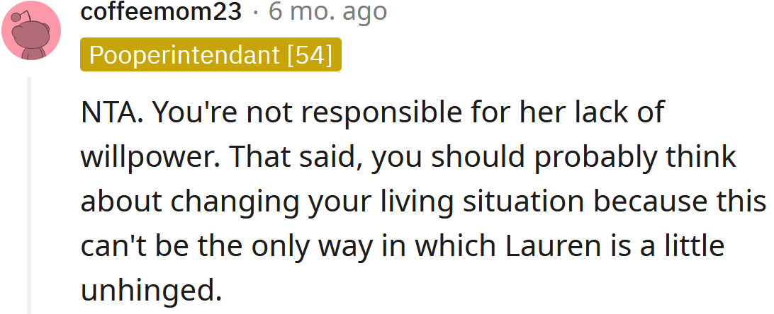 What are your thoughts on this situation? Do you think the OP is doing the right thing by agreeing to Lauren's rules, or should she stand up to her and continue cooking her own food?