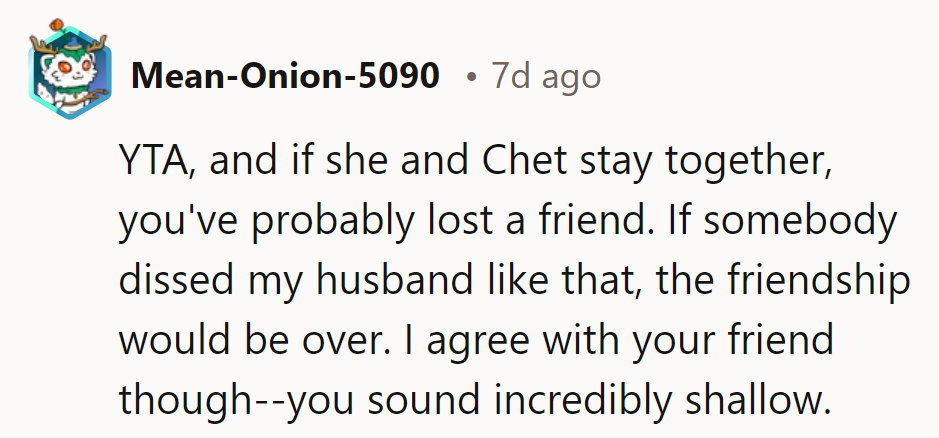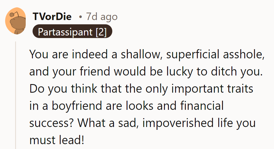When asked for her thoughts, the woman criticized the boyfriend's looks and financial situation. Her blunt assessment was meant to be protective but instead came off as harsh and judgmental, leading her friend to call her shallow and straining their relationship.