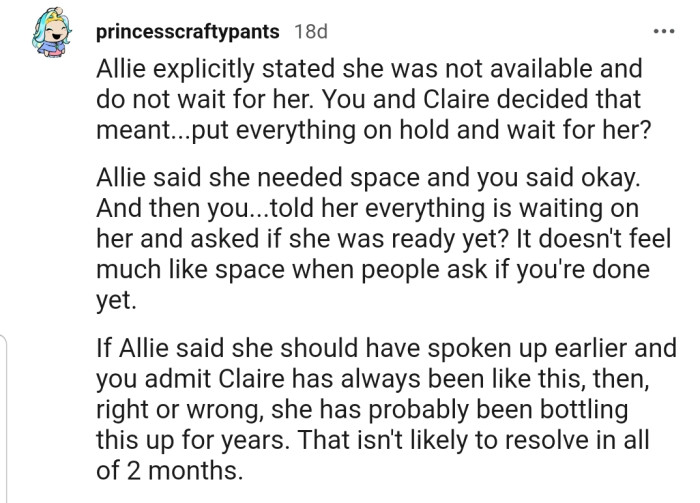 Reddit.comAllie has decided to break away from their friend group due to Claire's behavior