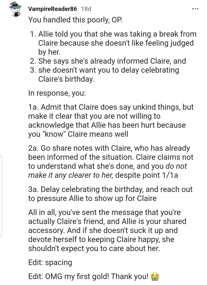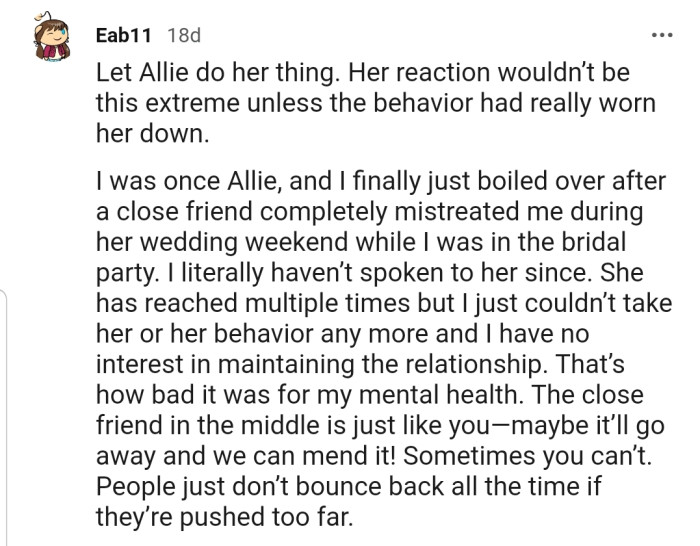 OP, however, is caught in the middle as she tries to save her friend group from collapsing. While she has good intentions, she is trying hard not to take sides or upset Allie in the process.