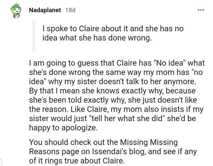 "I am going to guess that Claire has 'no idea' what she's done wrong the same way my mom has 'no idea' why my sister doesn't talk to her anymore."