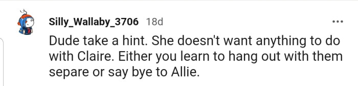 Reddit.comInterestingly, Claire has no idea what she has done wrong. In addition, Allie has warned OP to avoid getting involved between them