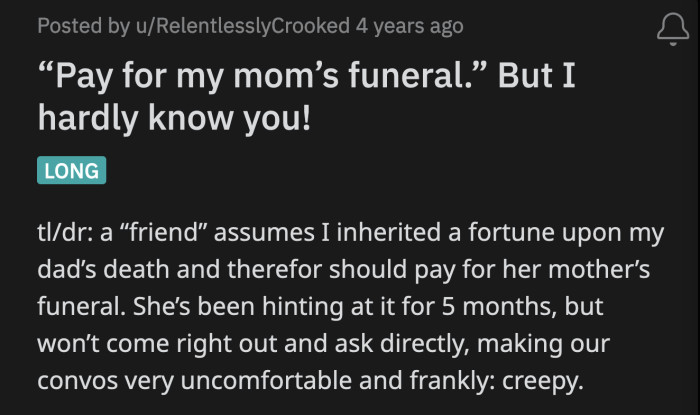 "Friend" Tries To Manipulate Acquaintance Into Paying For Her Living Mother's Future Funeral