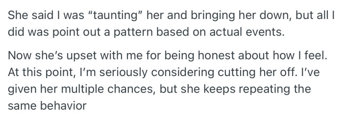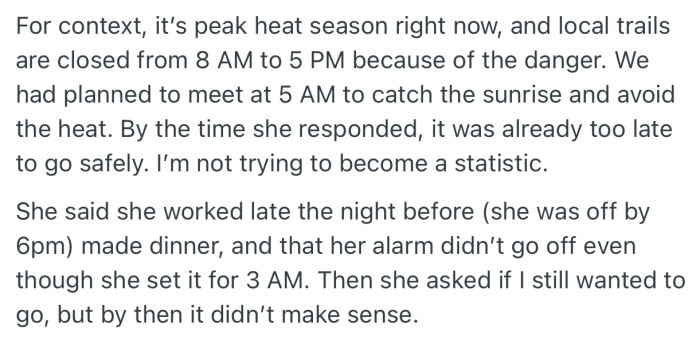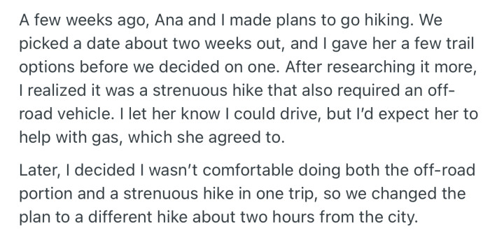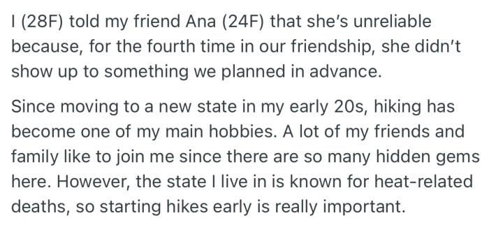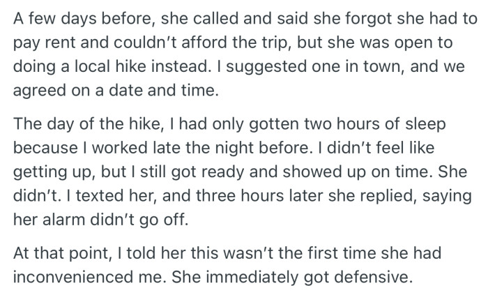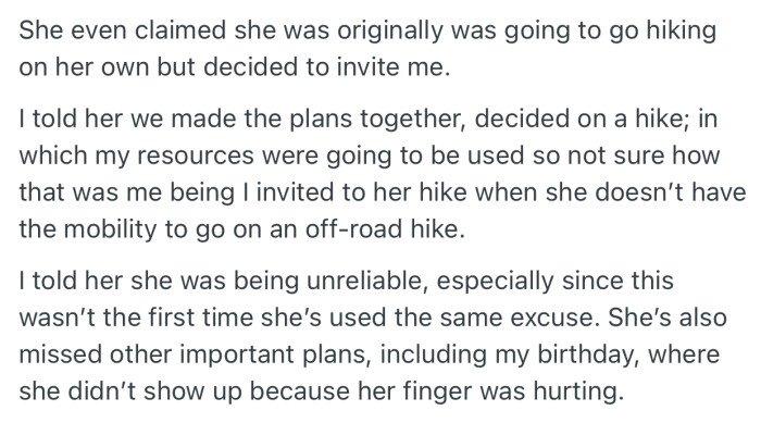 And once the friend started pushing back on the “unreliable” label, the conversation stopped being about the trip and became about who gets to feel wronged.