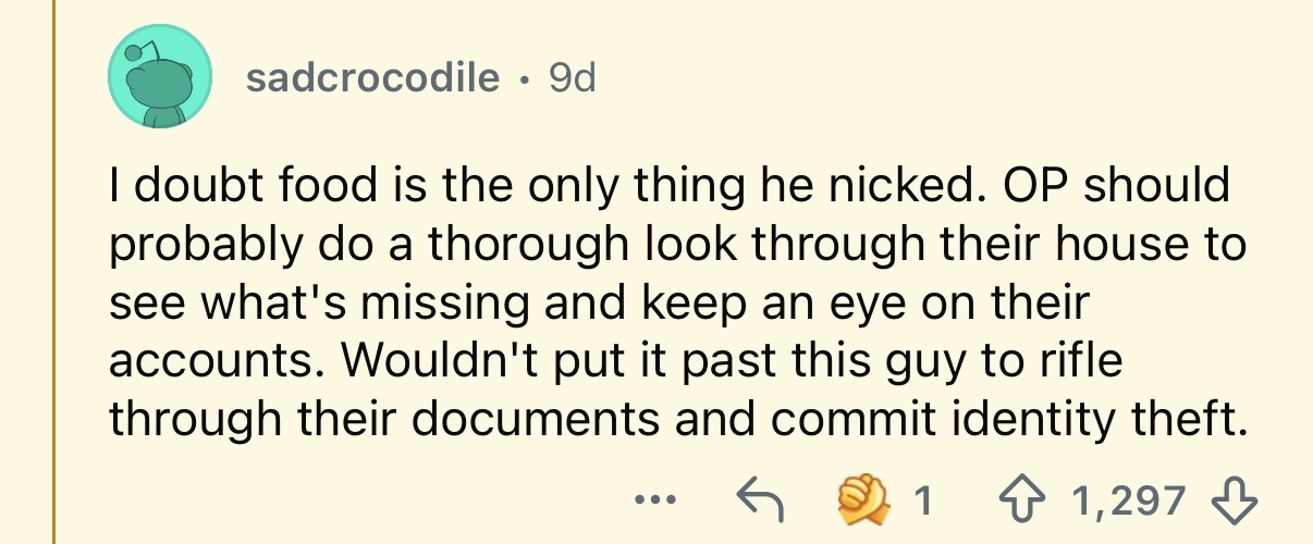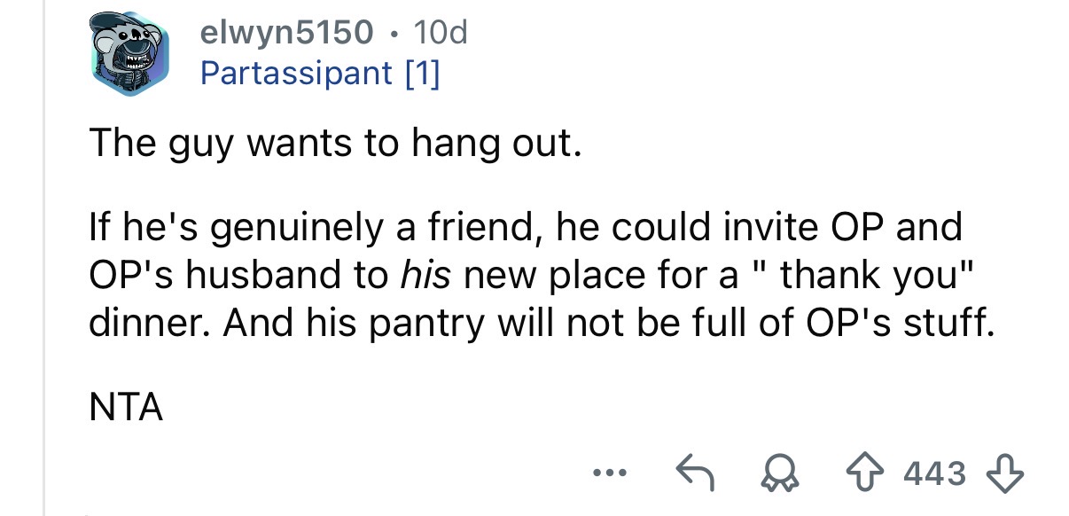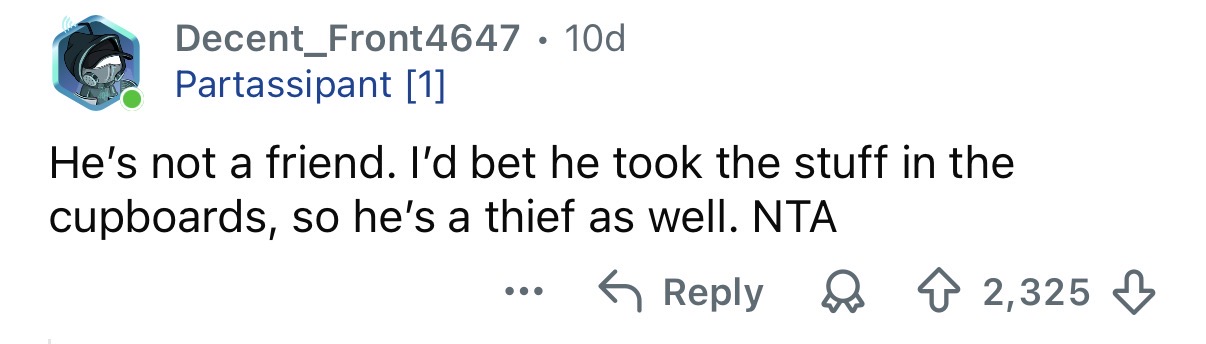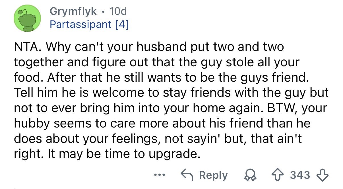 Her husband thinks she’s being too harsh, but honestly? Internet commenters were firmly on her side. Because when someone eats six months’ worth of food, disrespects your home, and then shrugs it off, “never again” sounds like the right answer.