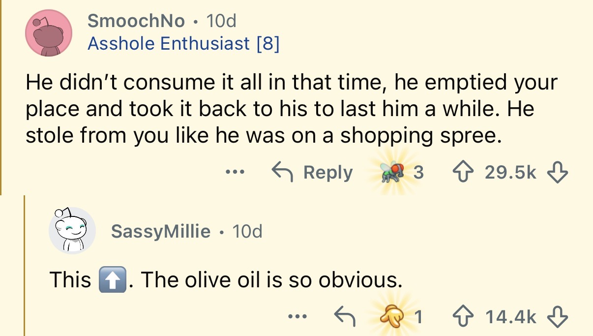 “The fridge, freezer, pantry — empty. He finished two jars of jam, a jar of peanut butter, an entire Costco-sized bottle of olive oil, all our condiments, rice, snacks, cheese — even my husband’s protein and collagen supplements.”