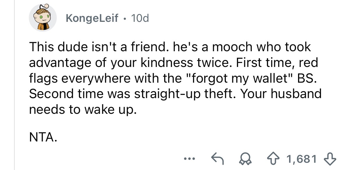 During that time, some things rubbed us the wrong way. He never bought groceries, and multiple times he pretended he was going to pay but “forgot his wallet” or claimed he could only use Apple Pay (not accepted at our local supermarket). He’d eat way more than his share (once my husband and I shared half a pizza, and he ate the other pizza and a half without contributing). Still, we felt bad for him, so we let it go.