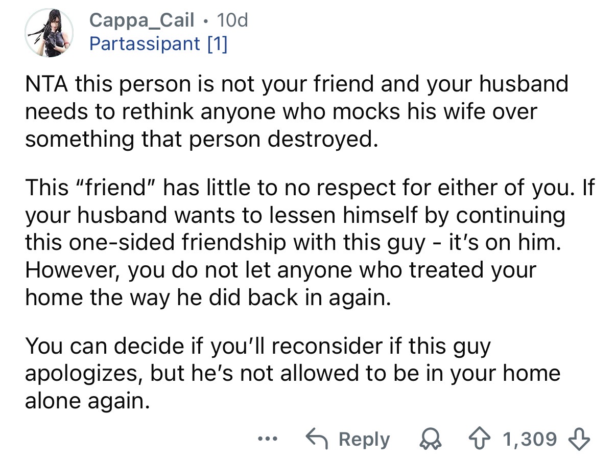 I didn’t confront him except to ask him to replace the pan, which he mocked me about (“it’s just a pan, why are you making it a big deal?”). I felt deeply disrespected. Now he keeps texting me, acting like nothing happened, and wants to hang out. I told my husband I don’t want him in our home ever again. My husband says I’m being too harsh, and if he wants to stay friends, that’s his choice, but I feel completely taken advantage of and disrespected.