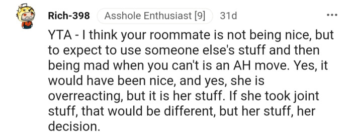 Later, when OP returned to their shared apartment from a weekend trip home, her roommate had moved all her belongings to her personal room. Additionally, she warned OP to refrain from using any of her things.