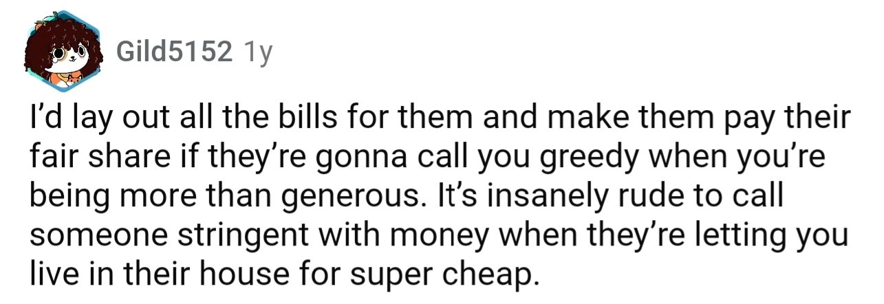 "It's insanely rude to call someone stringent with money when they're letting you live in their house for super cheap"