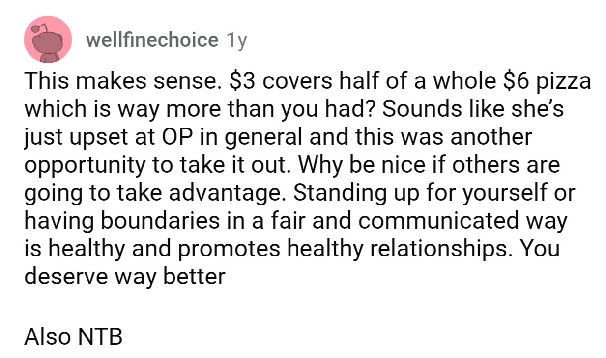 As the pizzas arrived, everyone chipped in what they could. OP, who had eaten less than half a pizza, offered a humble $3 to cover what they had consumed. They explained that they wanted to do their part even though they had eaten so little, but their roommate flatly refused the contribution. No harm, no foul, right? Not quite.